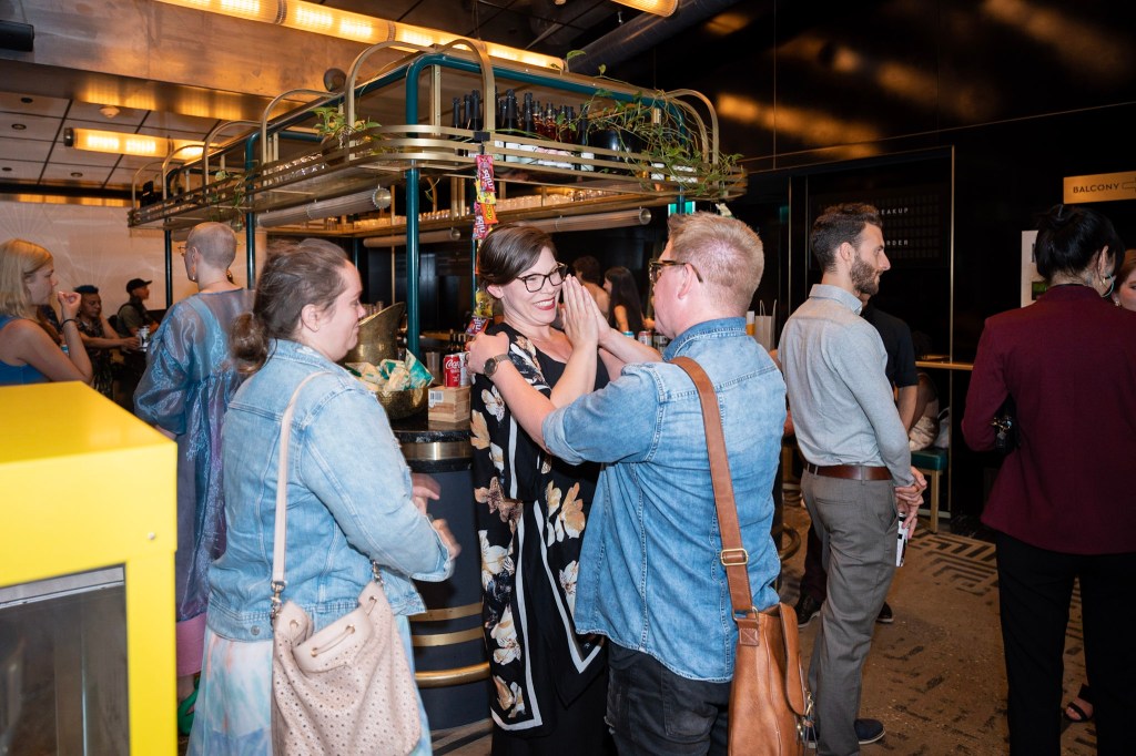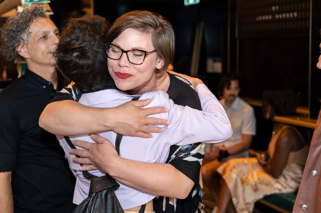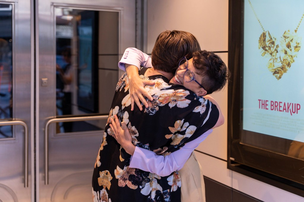 Director Jenna Harder posing beside the official poster for “The Breakup” at the Paradise Theatre premier.
